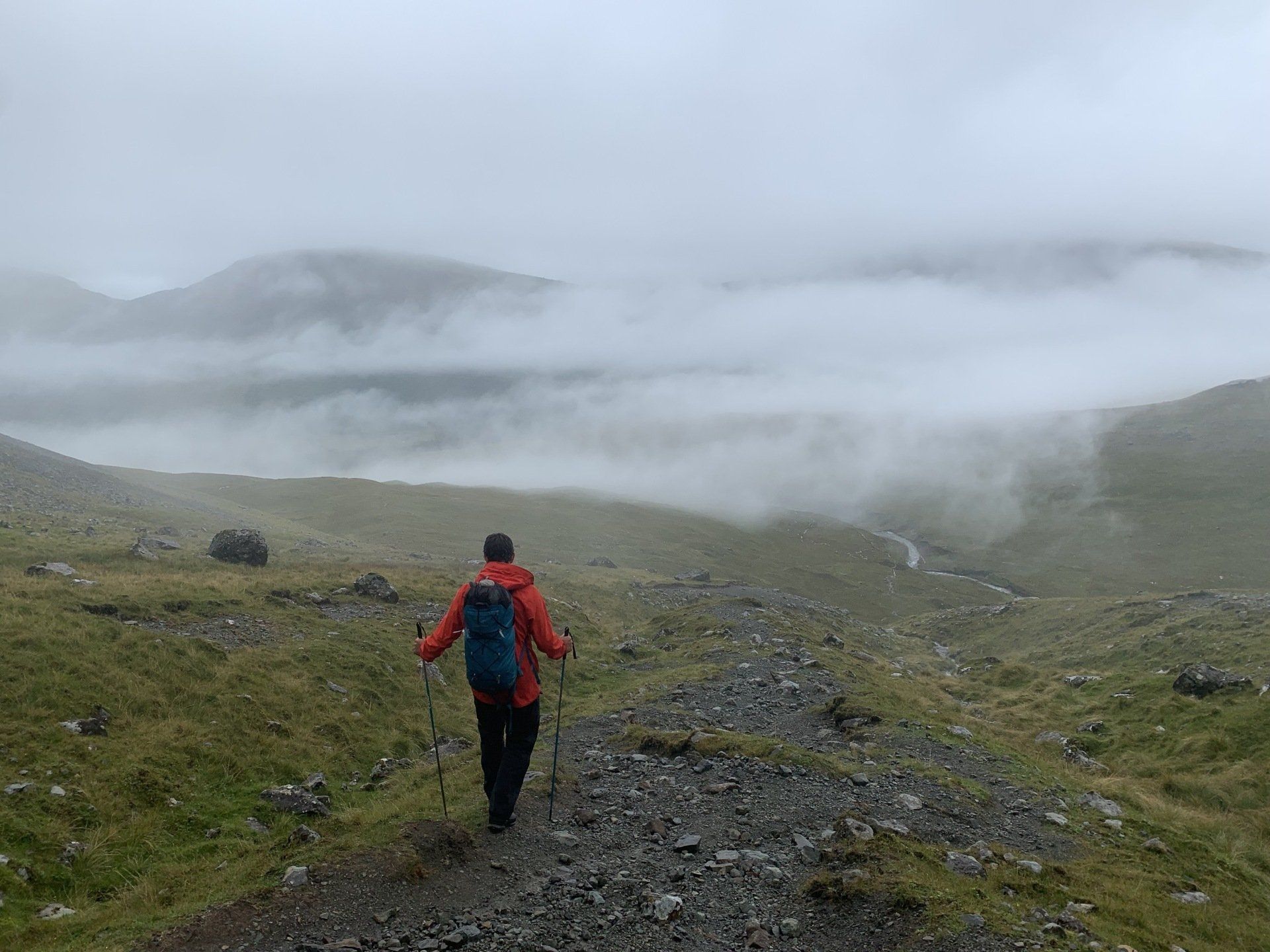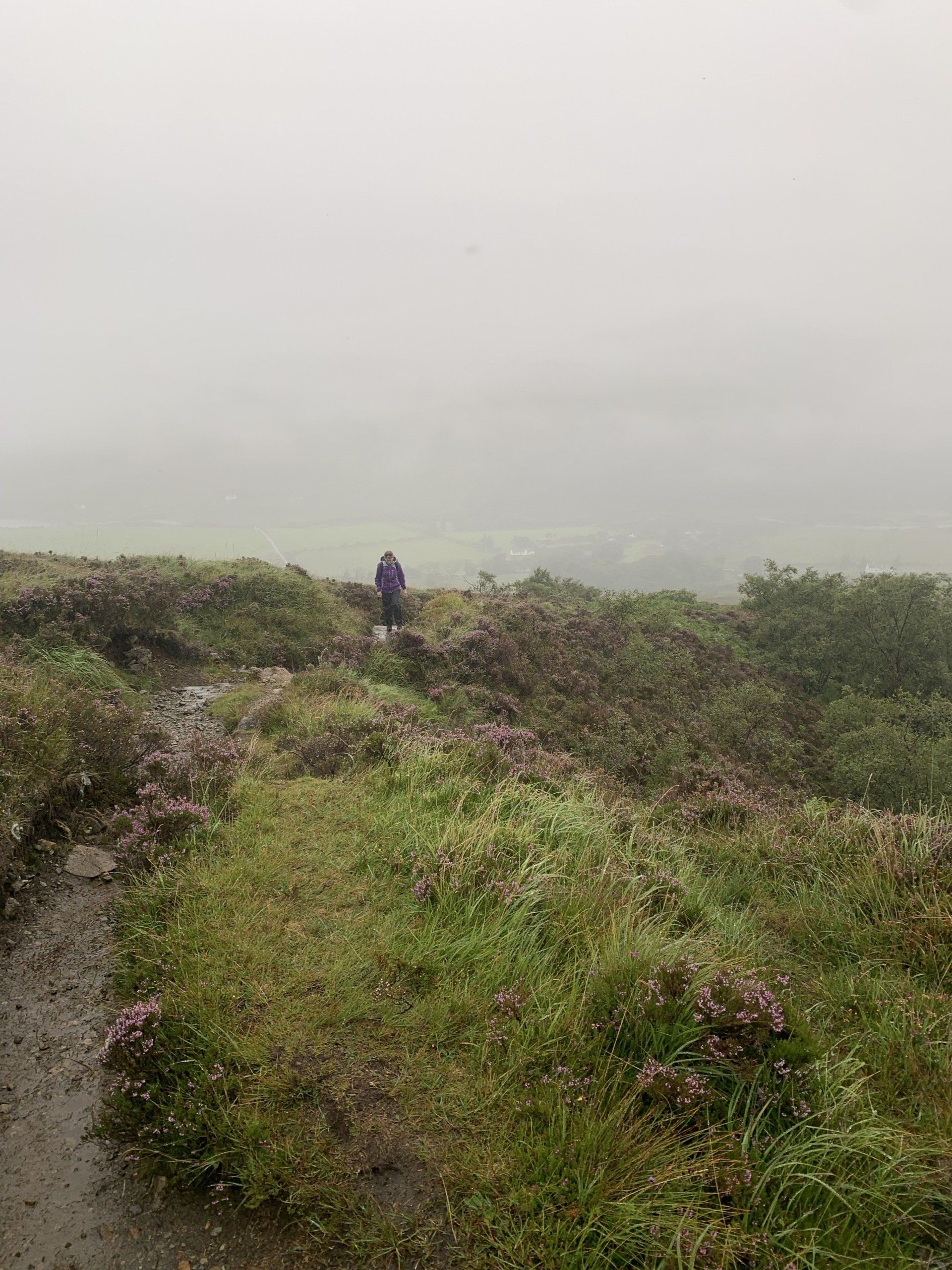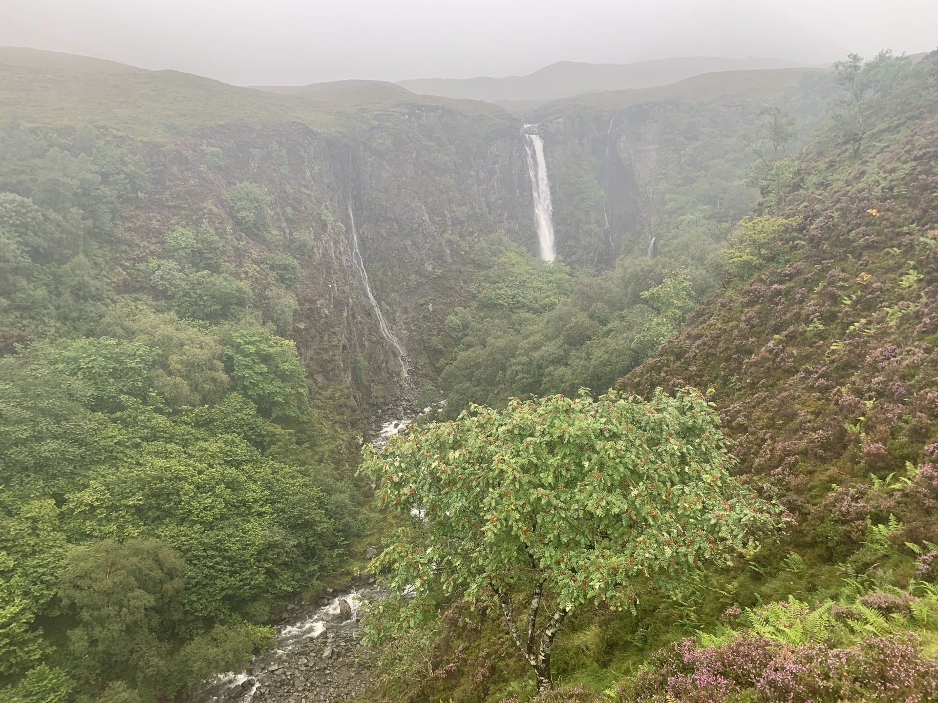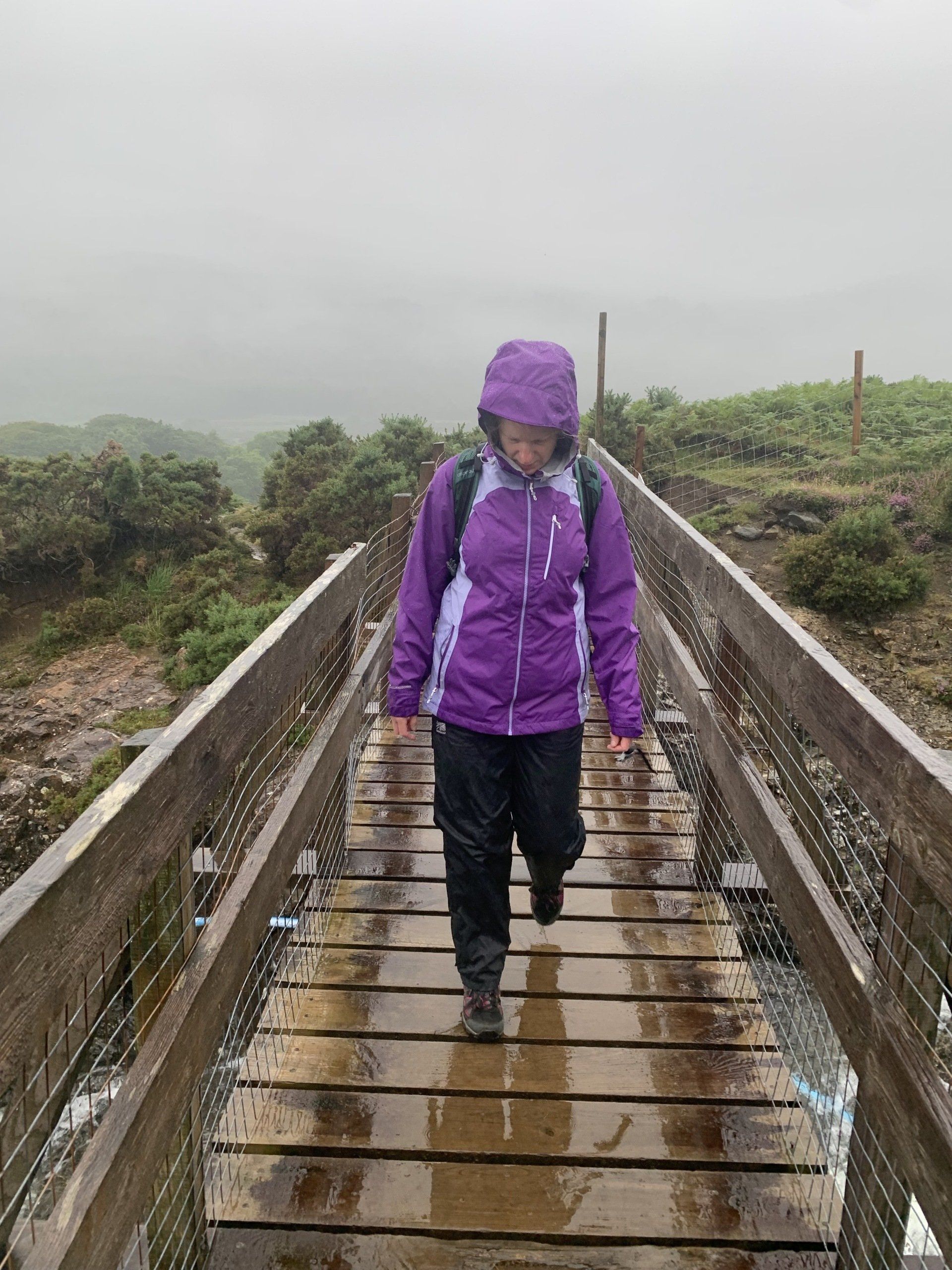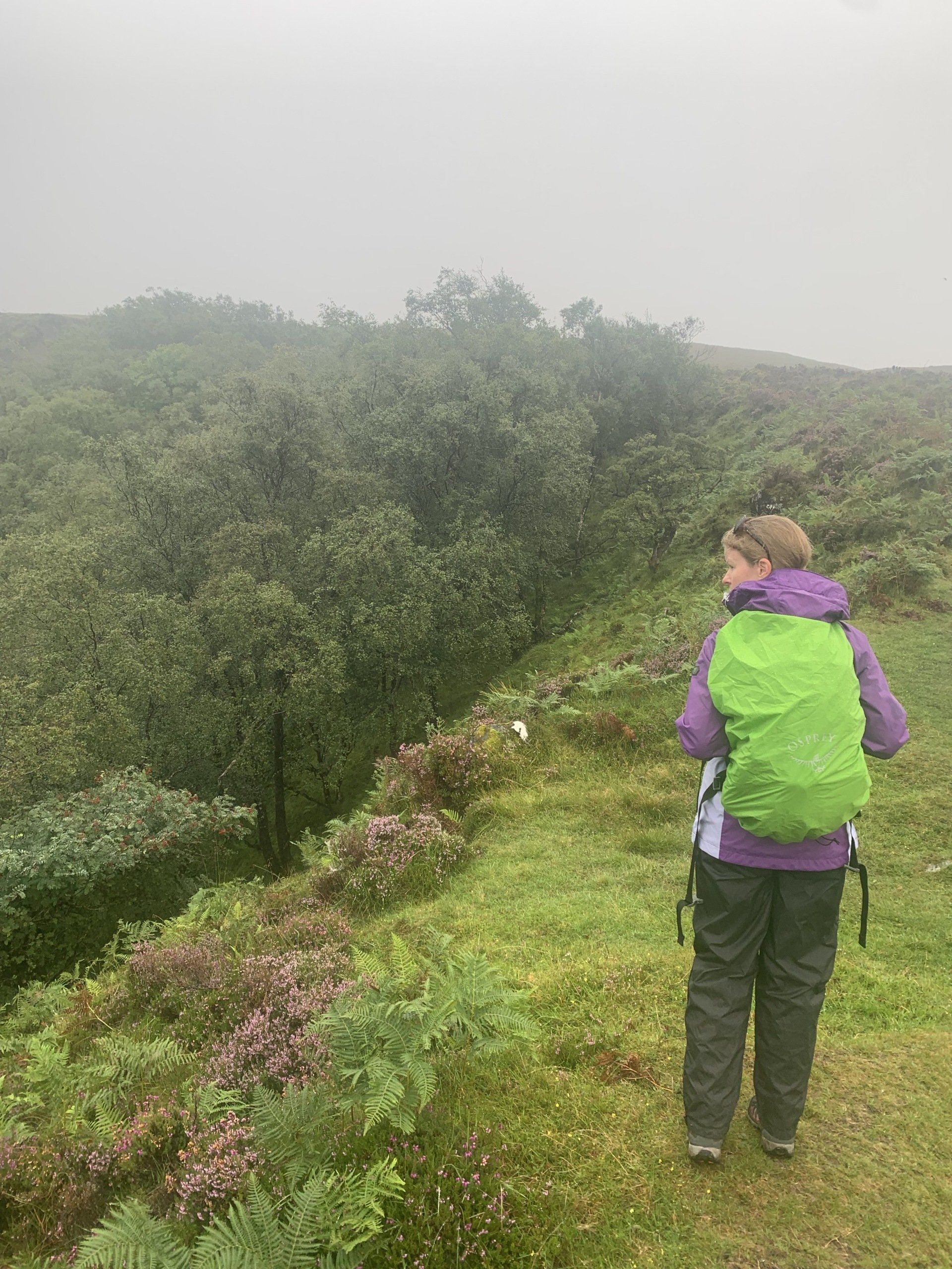 Aug 2021 - (with Gemma and Caspar - guide) Ascent from Glenbrittle Memorial Hut. Just an amazing day despite the poor weather. We met our guide (the bloke with all the ropes, harnesses, helmets and technical climbing kit) at 7:30am in Glenbrittle. His name was Caspar and we warmed to him immediately. Just as well, as what was coming up was possibly the most challenging thing either of us have done to date on a mountain - the 'In Pinn' or the Inaccessible Pinnacle. It is the second highest summit in the Skye Cuillin and notorious as the most difficult of the Munros, requiring a rock-climb and an abseil to complete the ascent. It rises from the summit of Sgùrr Dearg. Although it was rainy and misty, the climb to the base of the Sgurr Dearg itself was superb with some enjoyable scrambling. After a snack, putting on harnesses and helmets and descending the scree to the start of the east ridge up the In Pinn, it was time to go. The ascent is essentially a steep fin of rock, 50 metres in length with yawning exposure on both sides. The initial climb is up a little chimney before shifting onto the crest for the rest of the ascent. Almost immediately, the crux of the climb is encountered, a tricky step up with poor holds, made worse in the wet. Swallowing down the exposure, we figured it out eventually, only to rise up a bit more and see the ridge narrow further and stretch forever upwards. Caspar was now out of sight, having secured the ropes at the first rest point. This made it really unsettling. Gemma refused to look down. I had a few glances and it was awful. The scrambling itself from the first rest point on is relatively easy as the ridge has natural steps. It's just ridiculous exposure. Photos don't do it justice as Caspar couldn't get his camera out or see us on the crest itself. The fact that the rope lies along the ridge also means that a slip off either side would mean a considerable fall before the rope would stop you. Caspar made this slightly less of an issue by using slings around rocks, putting the ropes through crevices and placing in cams at one point. I was tethered to Gemma so if she went off, I would have too and fallen two metres further! If Caspar had fallen off, we would be absolutely...stuck! With these delights circling in my mind and with Gemma performing some hilarious, unorthodox moves, we made it safely to the top. Relief. The abseil down, although scary was nothing in comparison to the climb up. Instead of descending via the route we had taken up to Sgurr Dearg, we crossed the ridge to Sgùrr na Banachdich before going down. Just the tree of us, up in the muck the entire time and we saw nobody else. Just a fabulous adventure. Gemma never wants to repeat it, but I will in better weather one day.