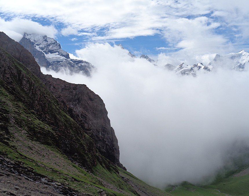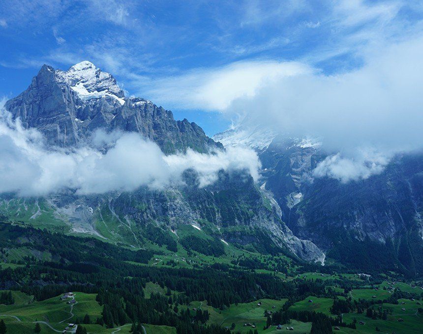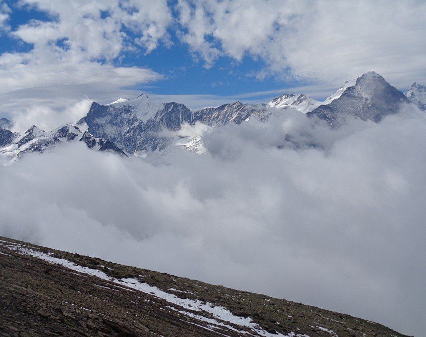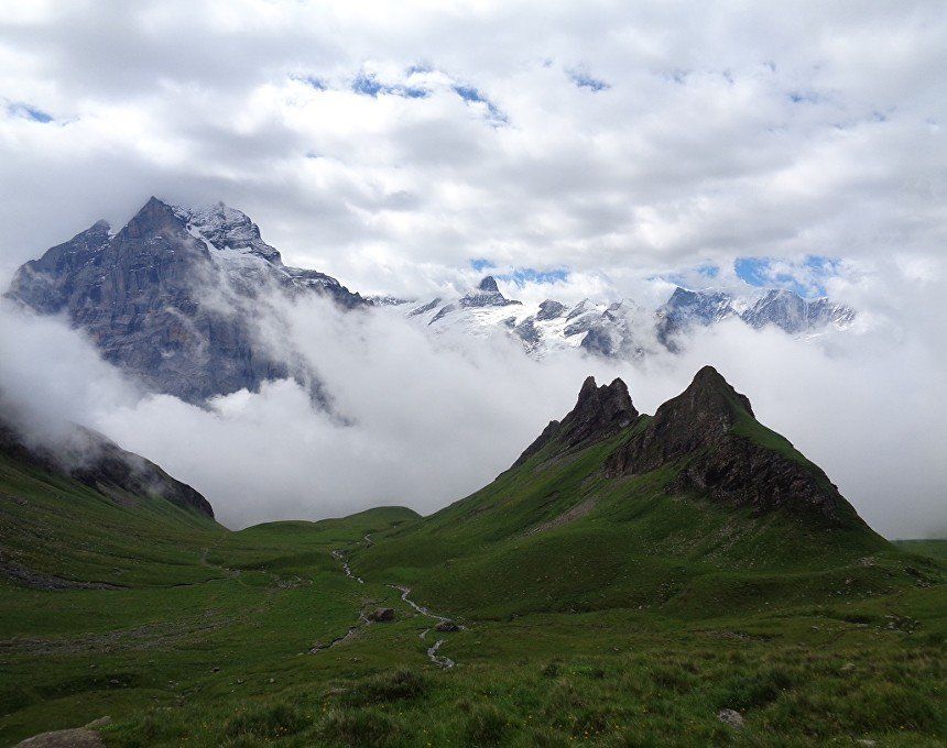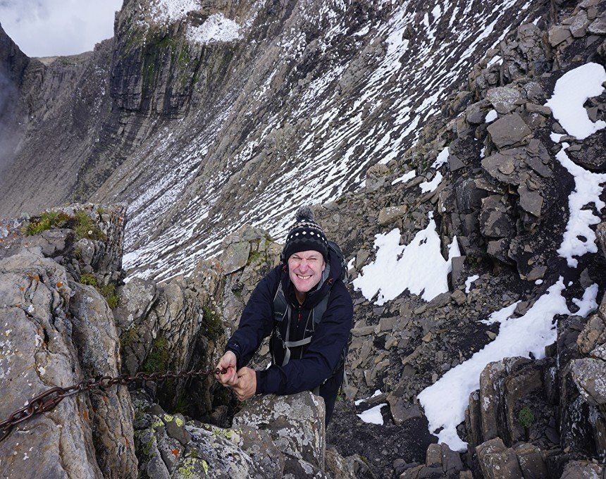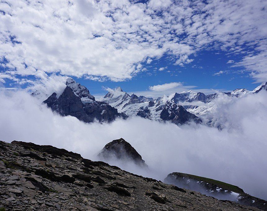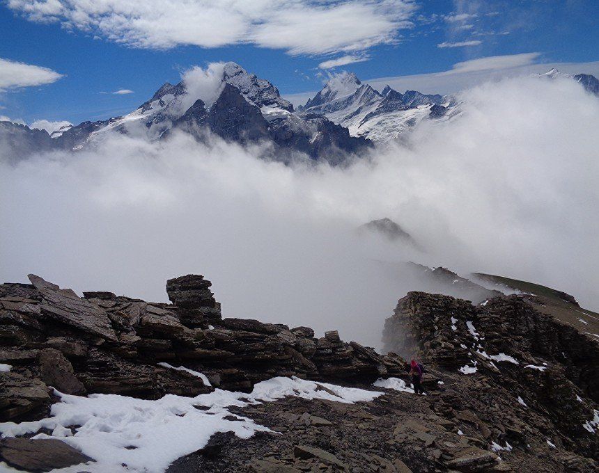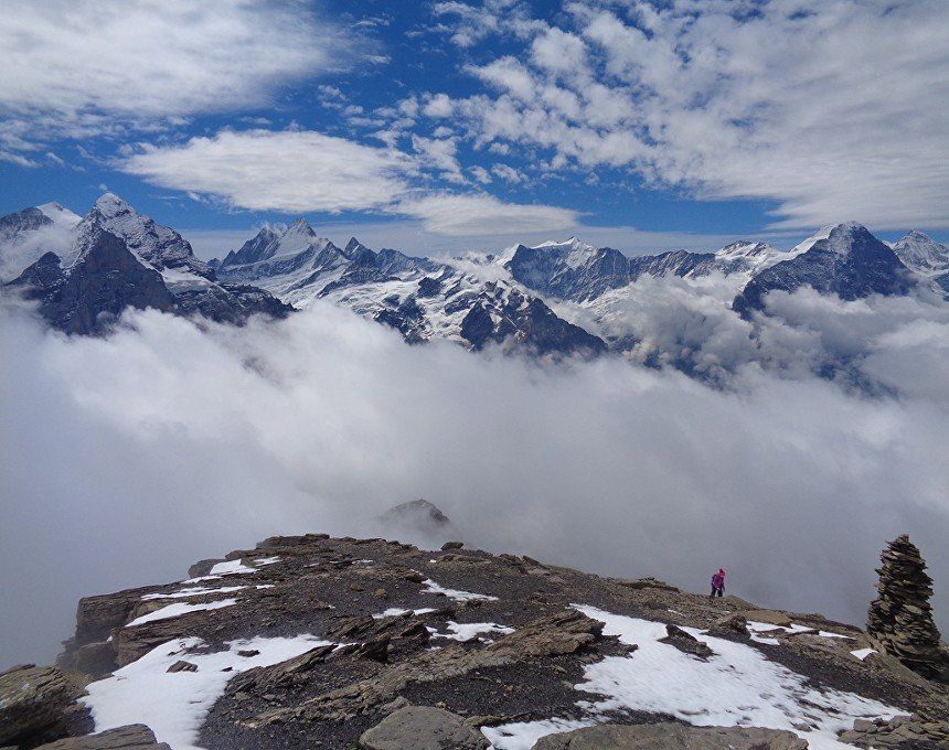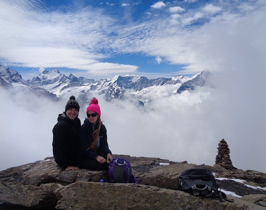 July 2017 - (with Gemma) Ascent from First, Grindelwald. Just a fantastic mountain hike took us to the top of our first Alp! A long cable-car ride took us to First, high above Grindelwald. After exploring the immediate area, including the cliff-traverse, a high-level metal bridge and balcony walk that hugs the edge of a huge crag, we set off. We saw a few marmots, plenty of jangly cows and a herd of deer as we ascended and the cloudscapes were ever-changing. Height was gained quickly and the oxygen levels made it slow-going in parts. Eventually a saddle is reached and then a pull up onto the south ridge. From here the views of the huge Alps, including the Eiger, the Jungfrau, Schreckhorn and Finsteaarhorn were spectacular. The scramble up the ridge was an unexpected delight, the drops to the east were into the cloud! At one point, there was a very large gap, which was protected by fixed chains. This required a careful downclimb to a notch before scrambling back up to the final summit ridge. We ate lunch on the summit, which was surprisingly mild. Views from the top were majestic. Descended the same way, enjoying the scrambles in reverse