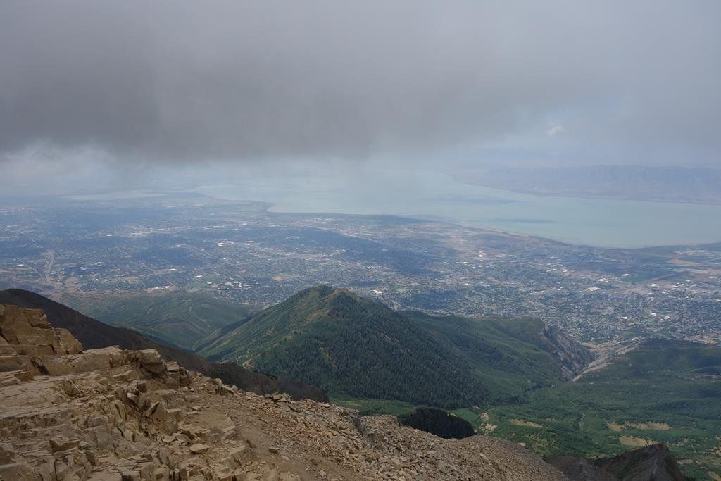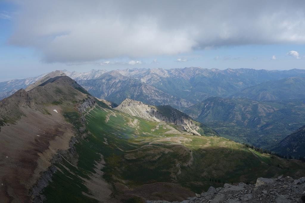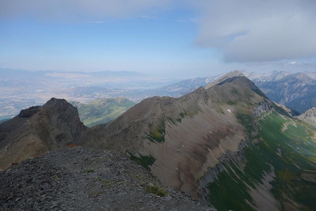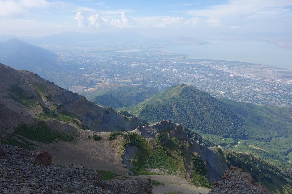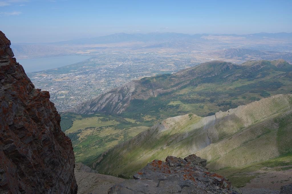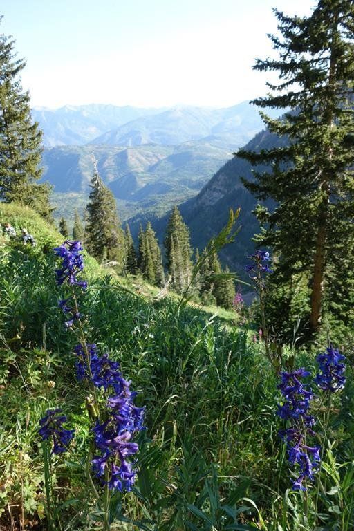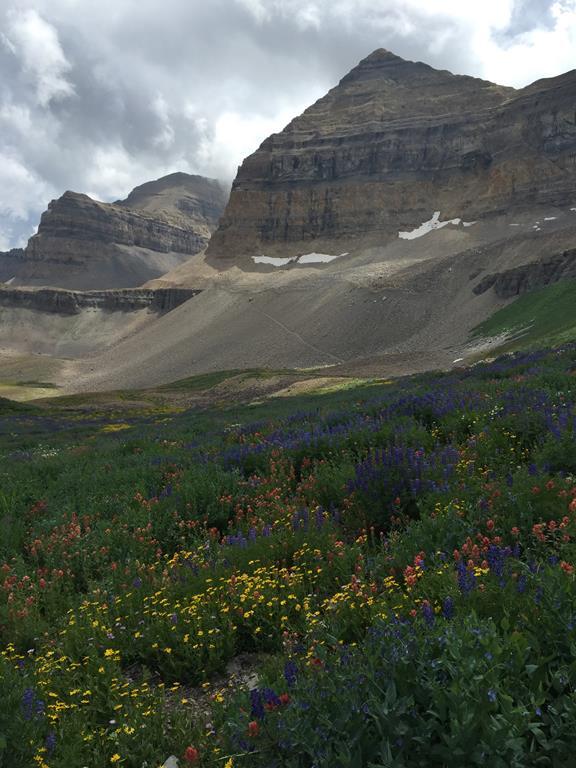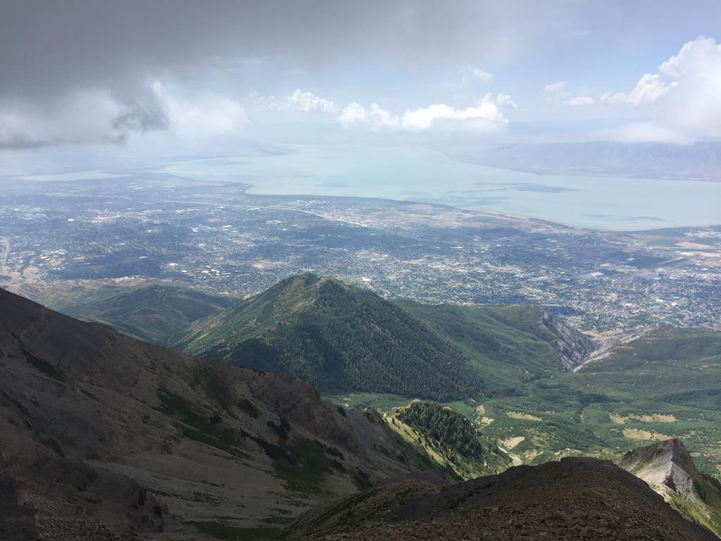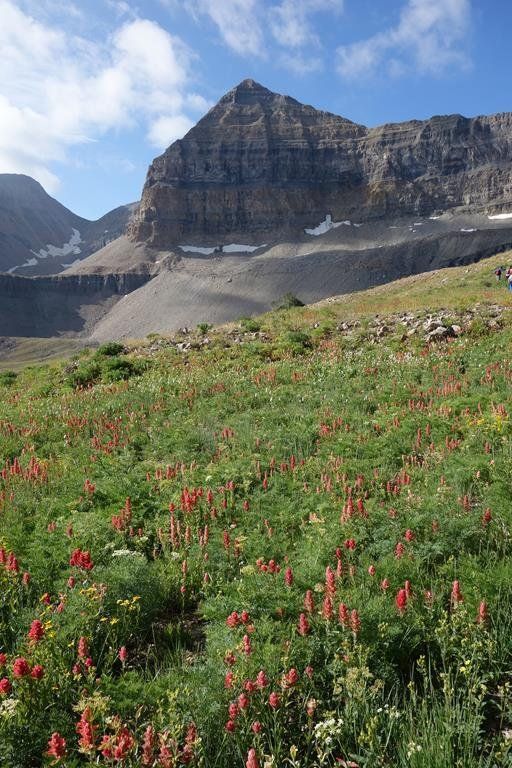 Aug 2016 - Ascent from Timpanookee Campground. Mount Timpanogos, sometimes informally referred to as Timp, is the second highest mountain in Utah's Wasatch Range. Timpanogos rises to an elevation of 11,752 ft (3,582 m) above sea level. The Wasatch Range is a mountain range that stretches approximately 160 miles from the Utah-Idaho border, south through central Utah in the western United States. It is the western edge of the Rocky Mountains. Although it is a 14-mile round-trip hike, with almost a mile of elevation gain, Timp's summit is one of the most-visited in the Rocky Mountains. This was a great hike on a superb trail that winds up through a canyon and across meadows with wildflowers. Eventually a rocky saddle is reached before a great summit ridge with stunning views of the deeper mountains and lower Salt Lake City. Met some fine folk on the way up and down and spent two and a half hours on the summit! Wild deer, goats and possibly a distant moose were seen along with dozens of chipmunks.