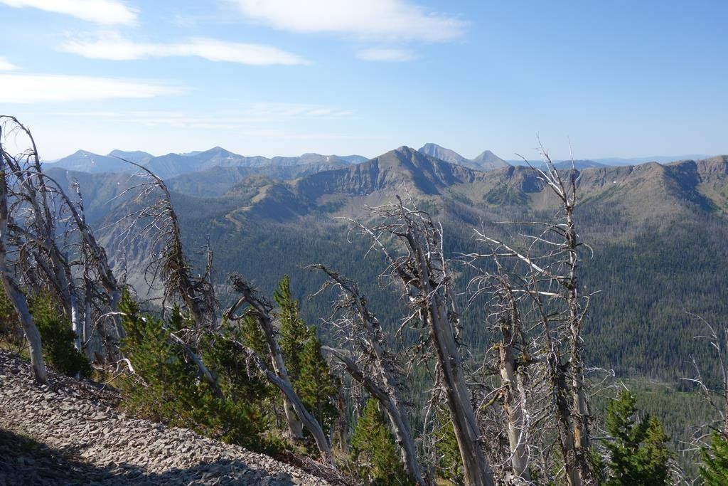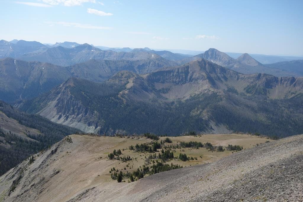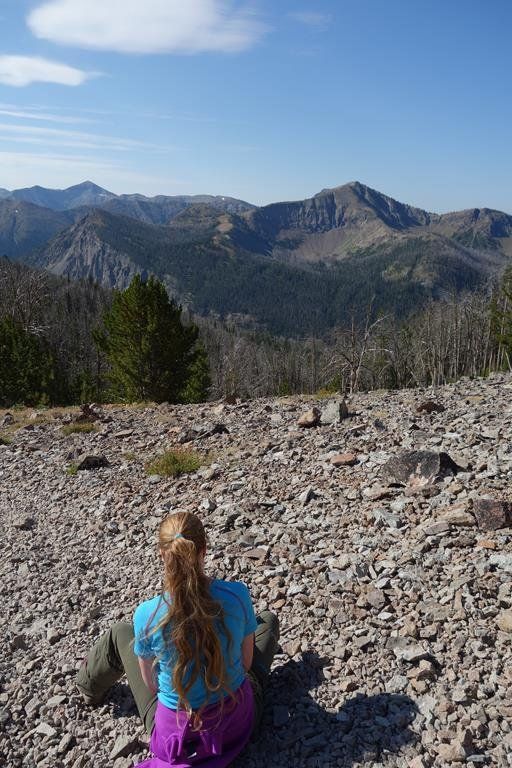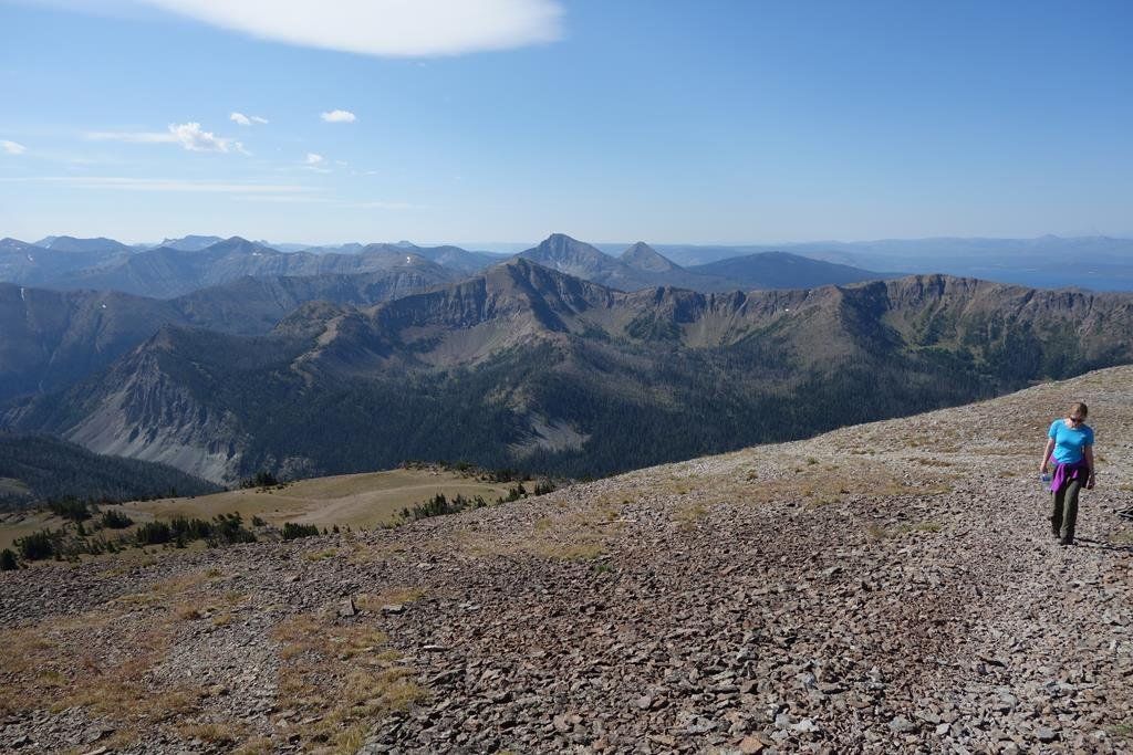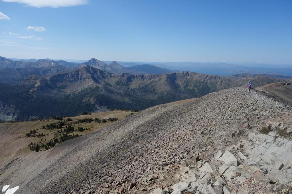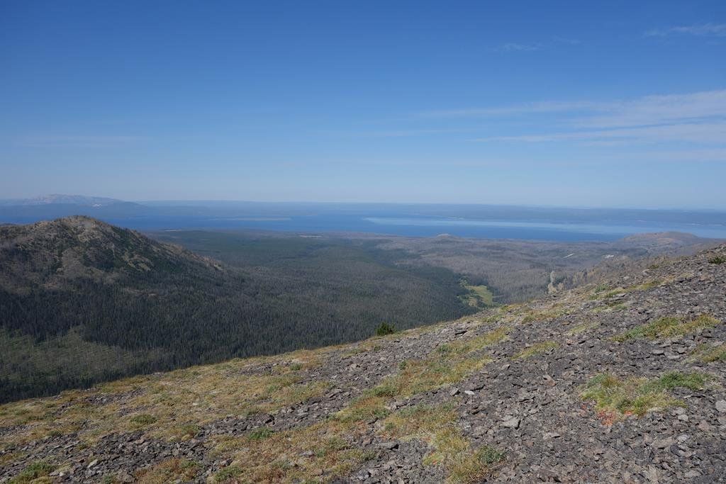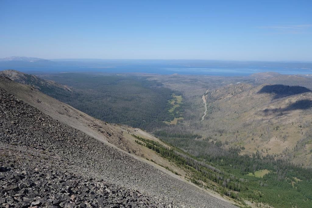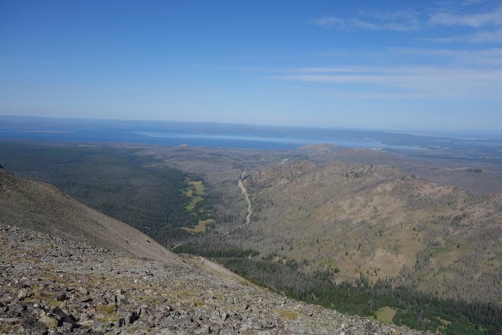 Aug 2016 - (with Gemma) Ascent from Eleanor Lake. It's a really strange/unsettling feeling... climbing a mountain when you know there's Grizzly Bears knocking about! We ascended in the knowledge that this trail is a 'high frequency Grizzly encounterance route.' The views were tremendous and the elevation and various vantage points enabled us to gain a real geography of the park. We made it to the summit 'bear free' and teamed up with another three hikers for the descent (one of them had bear spray, a cannister that resembles a fire extinguisher...extra bonus.) I'd love to see a bear, but at a distance. Views from the summit, as you'd expect, were amazing across Yellowstone Lake and down to the Tetons.