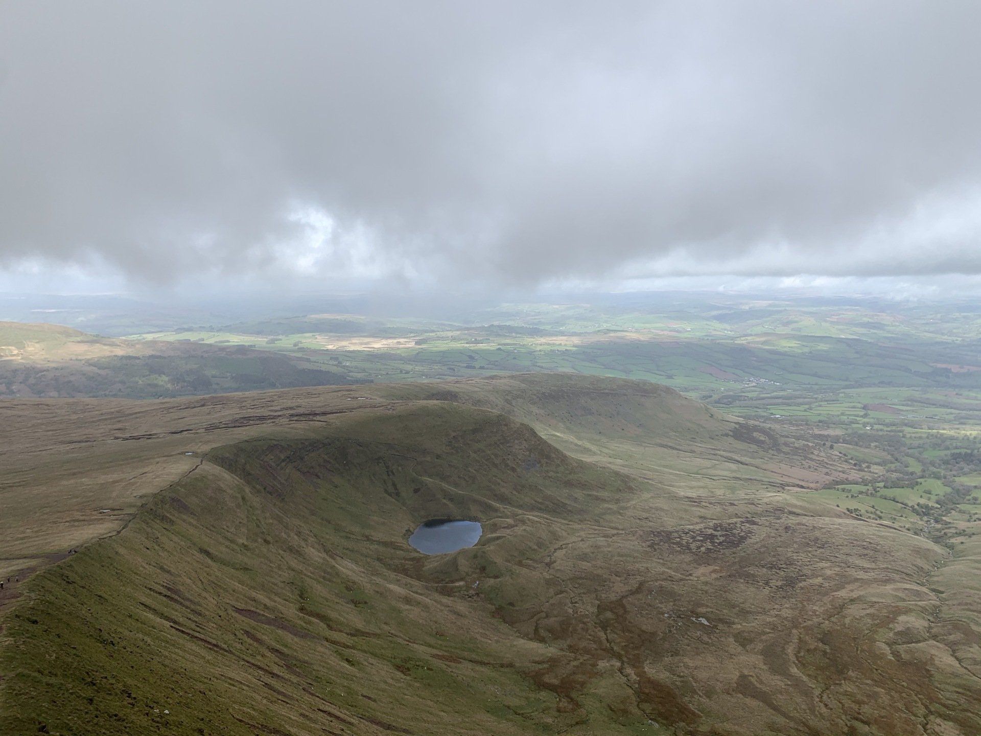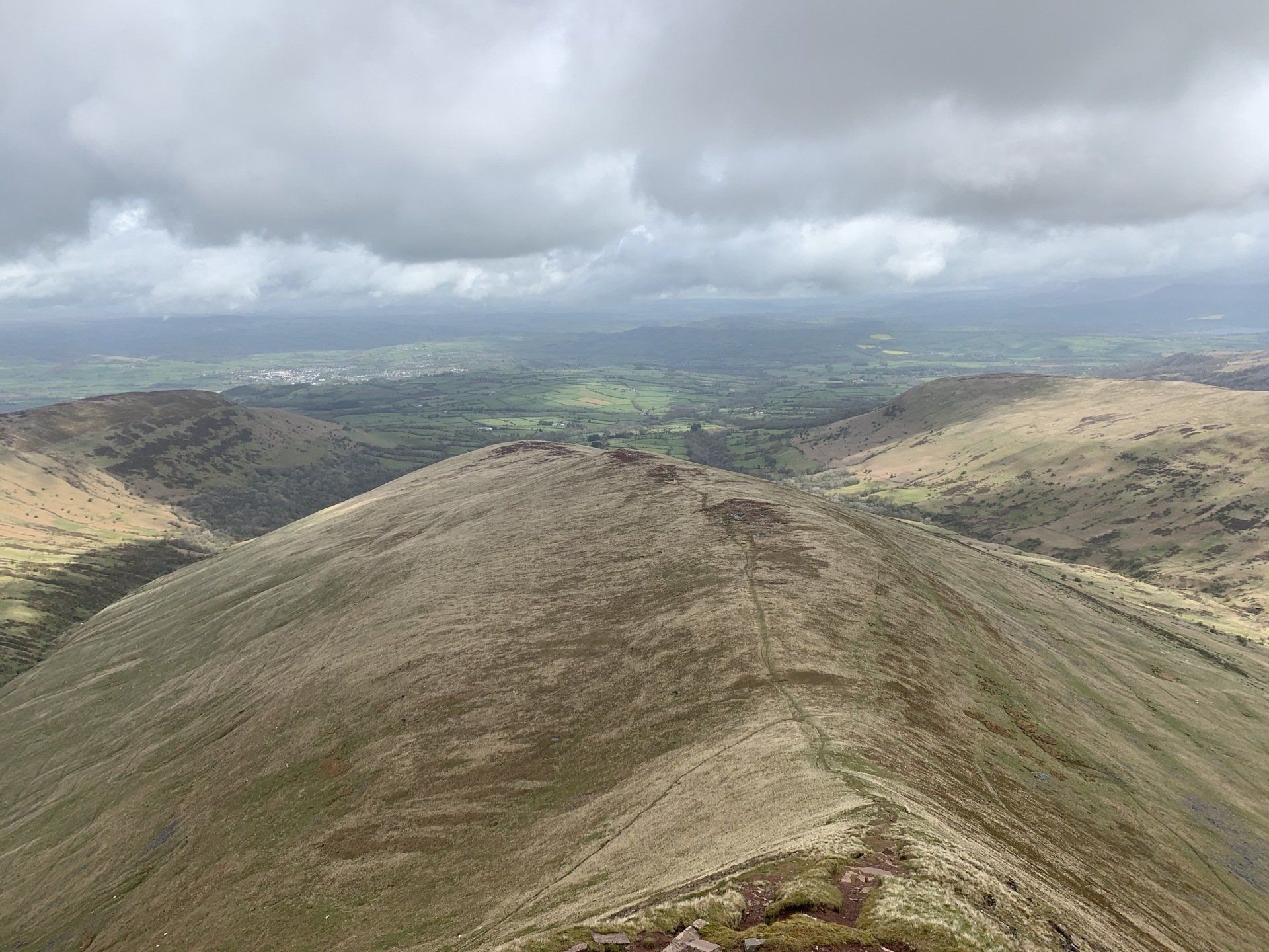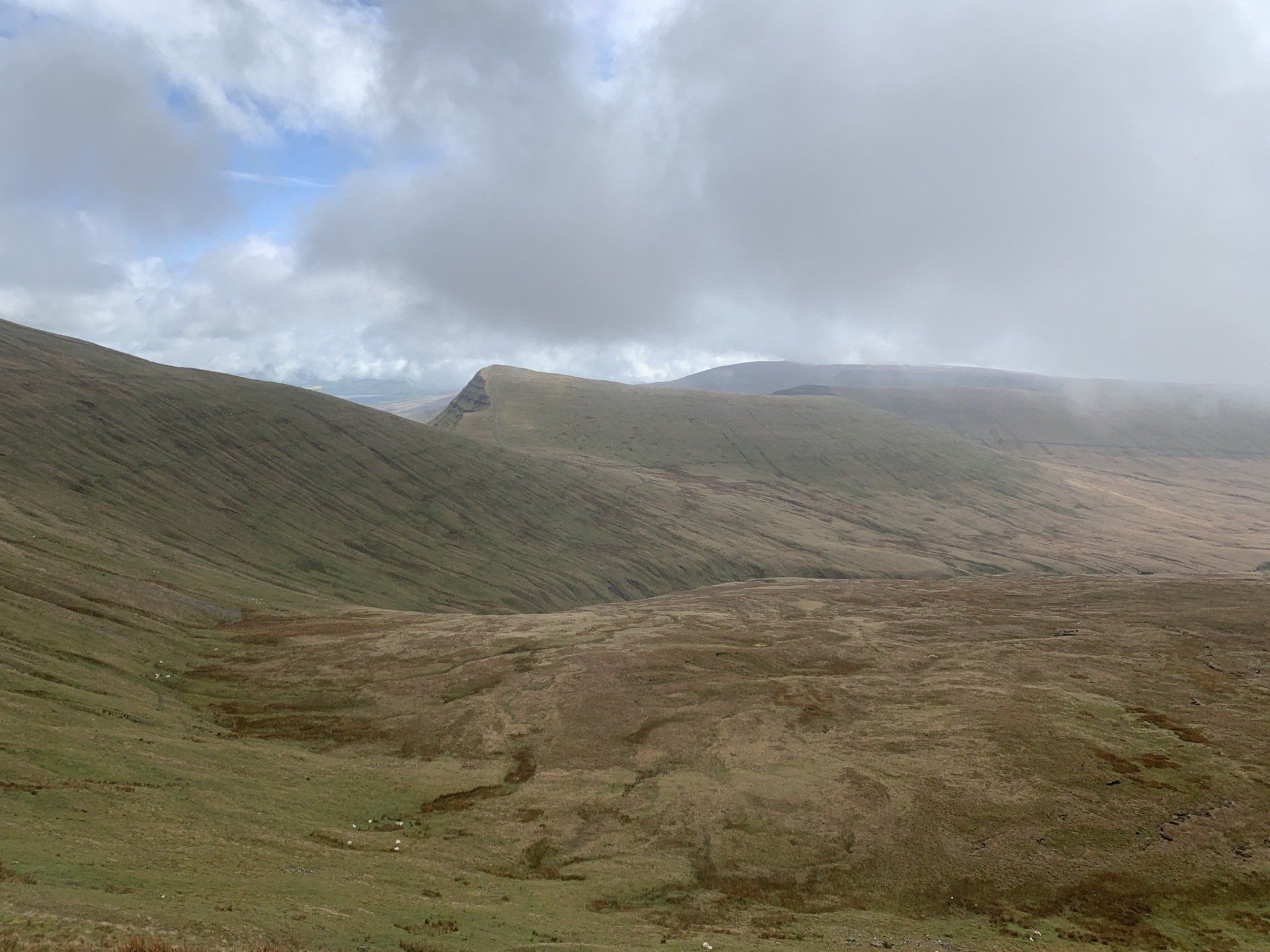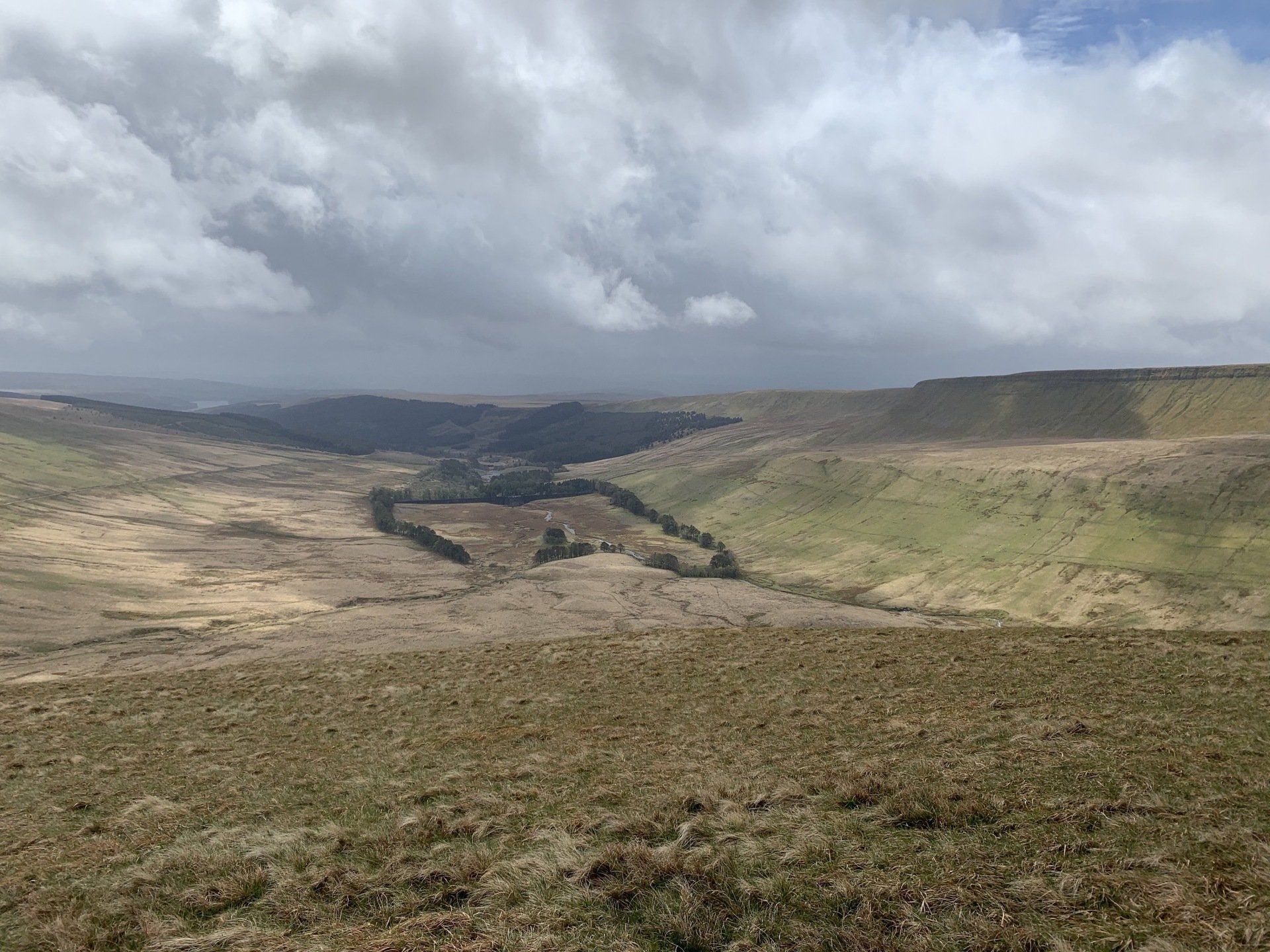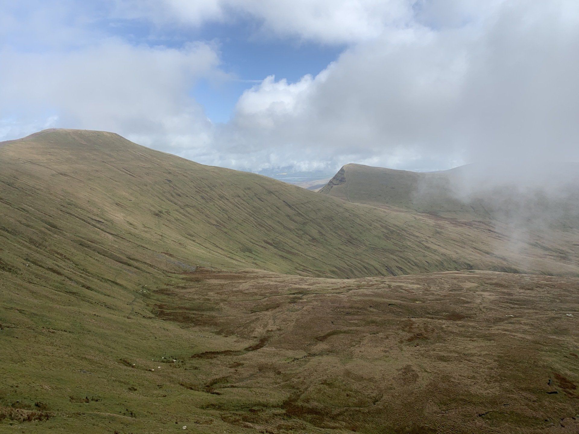 May 2021- Ascent from Pont Cwmyfedwen. Really enjoyed today’s walk. Despite a bleak weather forecast, it turned out okay, especially on the tops. As an added bonus, the negative forecast kept a significant amount of people away. Had to park further down the valley for the start, as there was masses of forestry work going on in the Neuadd normal start point. The churned up mess that was last here when I passed the lower Neuadd reservoir that they are rewilding is no more. To be fair, they’ve done a good job in reshaping the heathland, reseeding the area and constructing a new path and bridge that passes over the ‘new’ river. On the Craig Fan Ddu ridge the clouds cleared for a couple of hours and the walking over the tops was great. Had lunch on Cribyn.